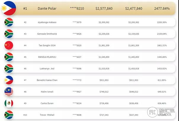 账号55778426的南非选手以2159.64%的盈利率获得第三名,本轮的冠亚季军的成绩悬殊非常小,不知道下一轮比赛又鹿死谁手呢,敬请期待~。